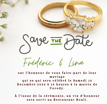La Cérémonie civile se tiendra à 15h à la mairie de Cocody, un événement mémorable qui marquera le début d'un nouveau chapitre dans la vie des mariés. Nous vous invitons cordialement à vous joindre à nous, car ce moment est précieux et il est important de le partager entouré de vos proches et amis. Après la cérémonie, il y aura un dîner au Restaurant Bonli, offrant une magnifique sélection de plats qui raviront vos papilles et rendront cette journée encore plus spéciale.